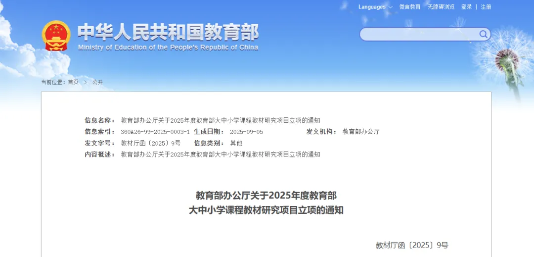 9月30日,教育部辦公廳發布關于2025年度教育部大中小學課程教材研究項目立項的通知。