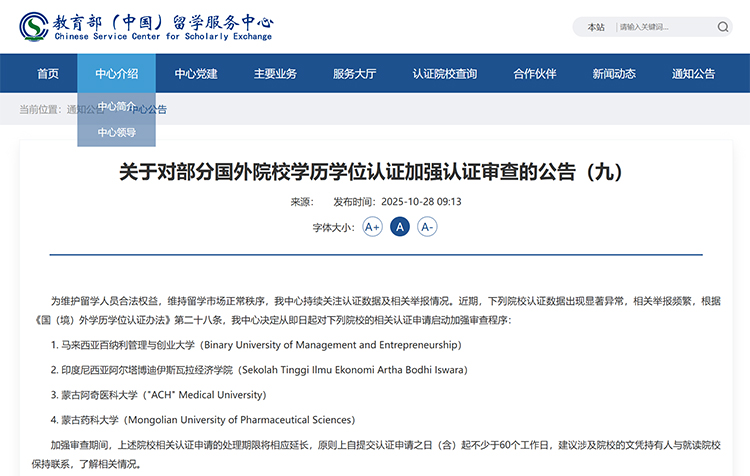 10月28日,教育部留學服務中心發布《關于對部分國外院校學歷學位認證加強認證審查的公告(九)》,決定對4所海外院校的相關認證申請啟動加強審查程序。
