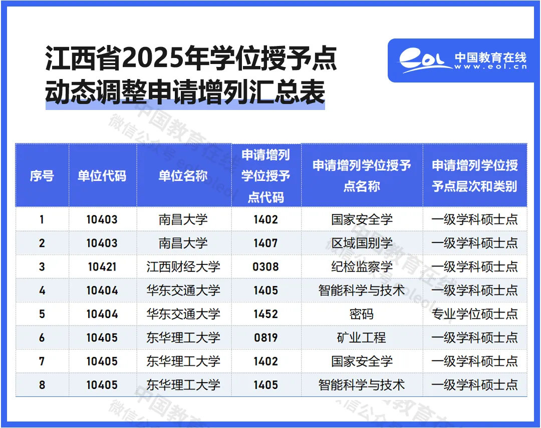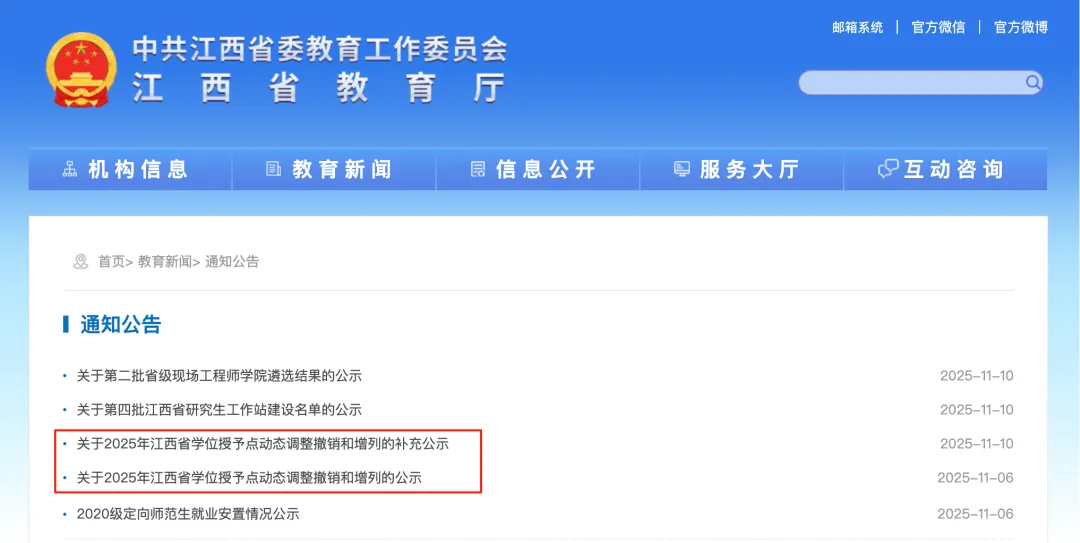 近日,江西省教育廳發布《關于2025年江西省學位授予點動態調整撤銷和增列的公示》、《關于2025年江西省學位授予點動態調整撤銷和增列的補充公示》。