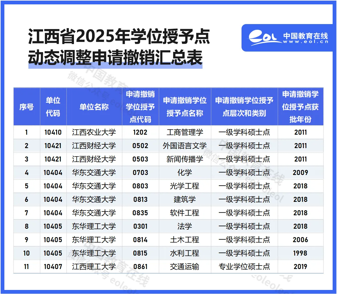 根據公示內容,江西省2025年學位授予點動態調整申請撤銷一級學科碩士點、專業學位碩士點共11個,申請增列一級學科碩士點、專業學位碩士點共8個。