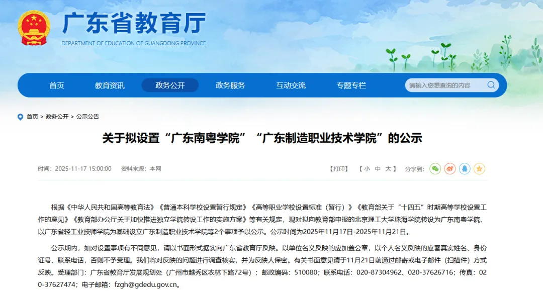 11月17日,廣東省教育廳發布《關于擬設置“廣東南粵學院”“廣東制造職業技術學院”的公示》。根據相關規定,對擬向教育部申報的北京理工大學珠海學院轉設為廣東南粵學院、以廣東省輕工業技師學院為基礎設立廣東制造職業技術學院等2個事項予以公示。