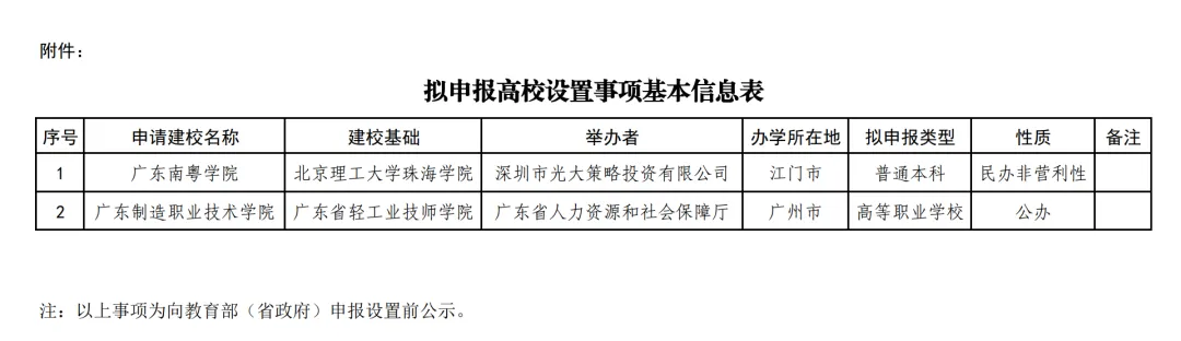 根據公示信息,擬申報的廣東南粵學院由深圳市光大策略投資有限公司舉辦,為民辦非營利性普通本科院校;廣東制造職業技術學院由廣東省人力資源和社會保障廳舉辦,為公辦性質高等職業學校。