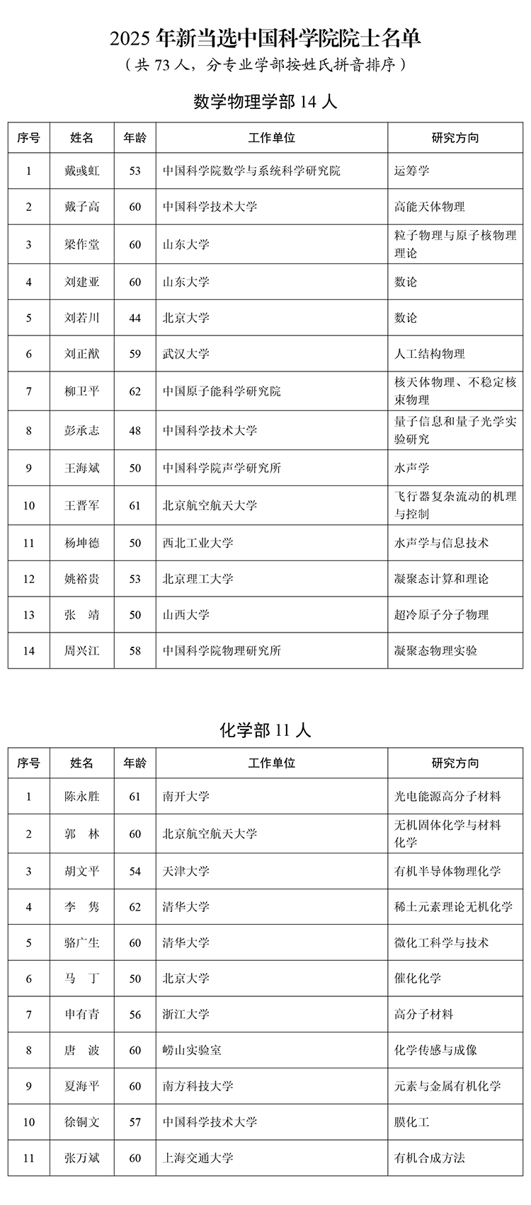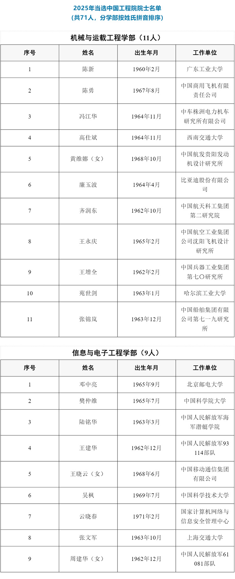 中國科學院、中國工程院11月21日公布2025年院士增選結果,分別選舉產生中國科學院院士73人,中國工程院院士71人。