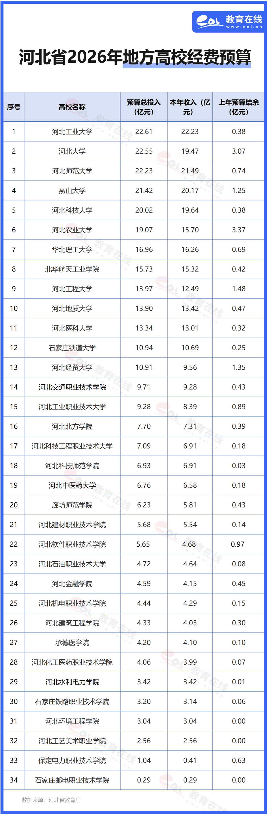 數據顯示,河北工業大學(22.61億元)、河北大學(22.55億元)、河北師范大學(22.23億元)、燕山大學(21.42億元)、河北科技大學(20.02億元)經費預算超過20億元,預算總收入排在全省前五。