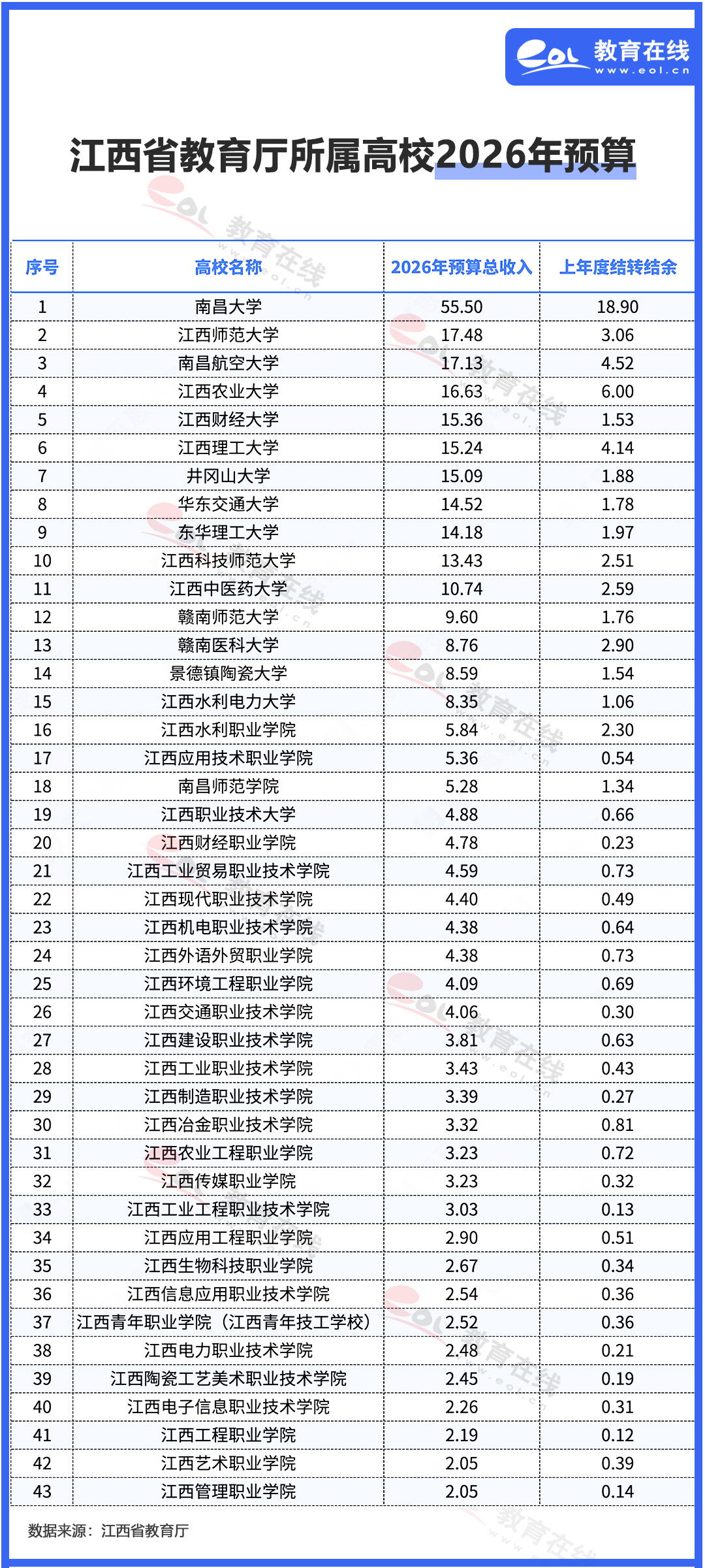 近日,江西省教育廳公布了2026年所屬單位預算信息,其中包含了43所高校。