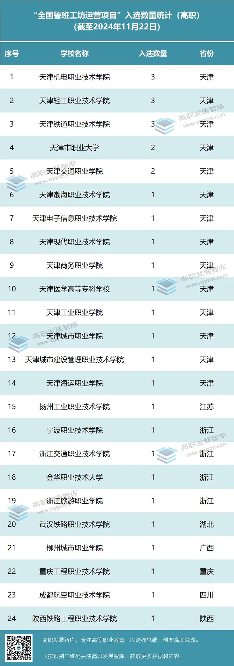 據高職發展智庫統計,截至2024年11月22日,共有34個項目被中國教育國際交流協會認定為魯班工坊運營項目。其中,全國共有24所高職院校的32個項目入選。