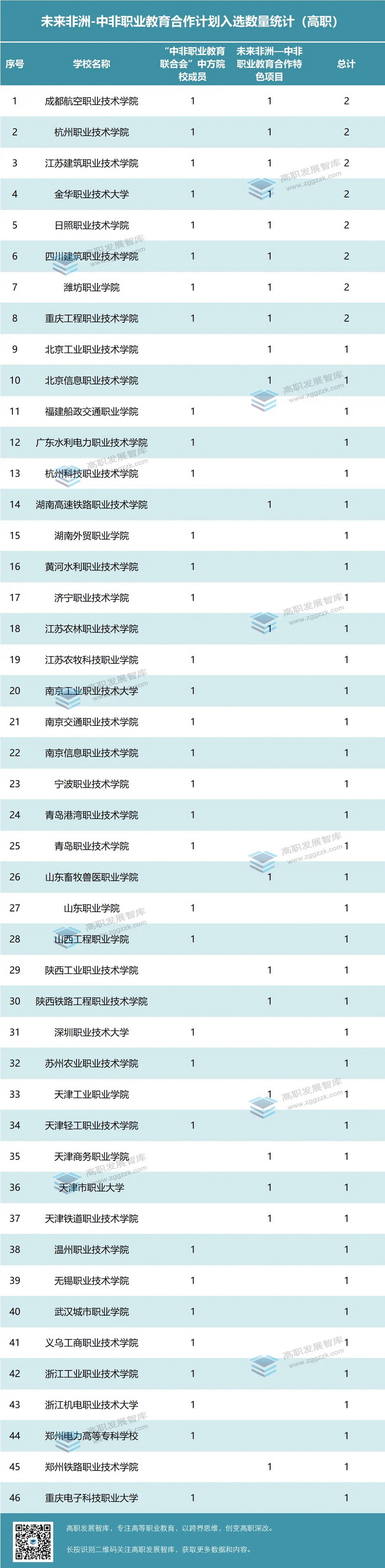 2024年8月,中國教育國際交流協會正式公布了“中非職業教育聯合會”首批中方院校成員擴容名單,共有20所高職院校入圍。截至2024年11月22日,全國共有34所高職院校入選“中非職業教育聯合會”中方院校成員名單。