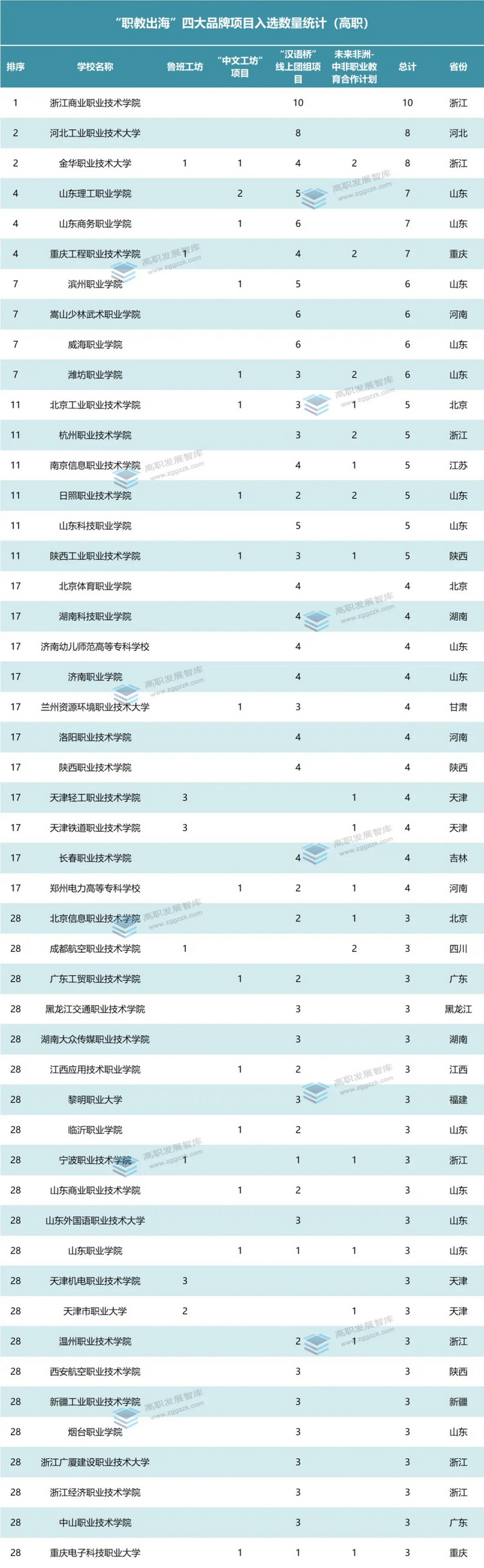 入選數量排在全國前十的高職院校還有:山東理工職業學院、山東商務職業學院、重慶工程職業技術學院、濱州職業學院、嵩山少林武術職業學院、威海職業學院、濰坊職業學院。