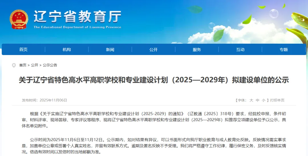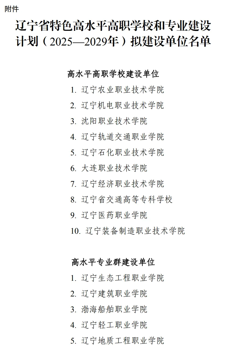 11月6日,遼寧省教育廳發布《關于遼寧省特色高水平高職學校和專業建設計劃(2025—2029年)擬建設單位的公示》。根據《關于實施遼寧省特色高水平高職學校和專業建設計劃(2025-2029)的通知》(遼教通〔2025〕318號)要求,經院校申報、條件初審、材料評審、現場答辯、專家評議等程序,現將遼寧省特色高水平高職學校和專業建設計劃(2025—2029年)擬推薦立項建設單位予以公示。