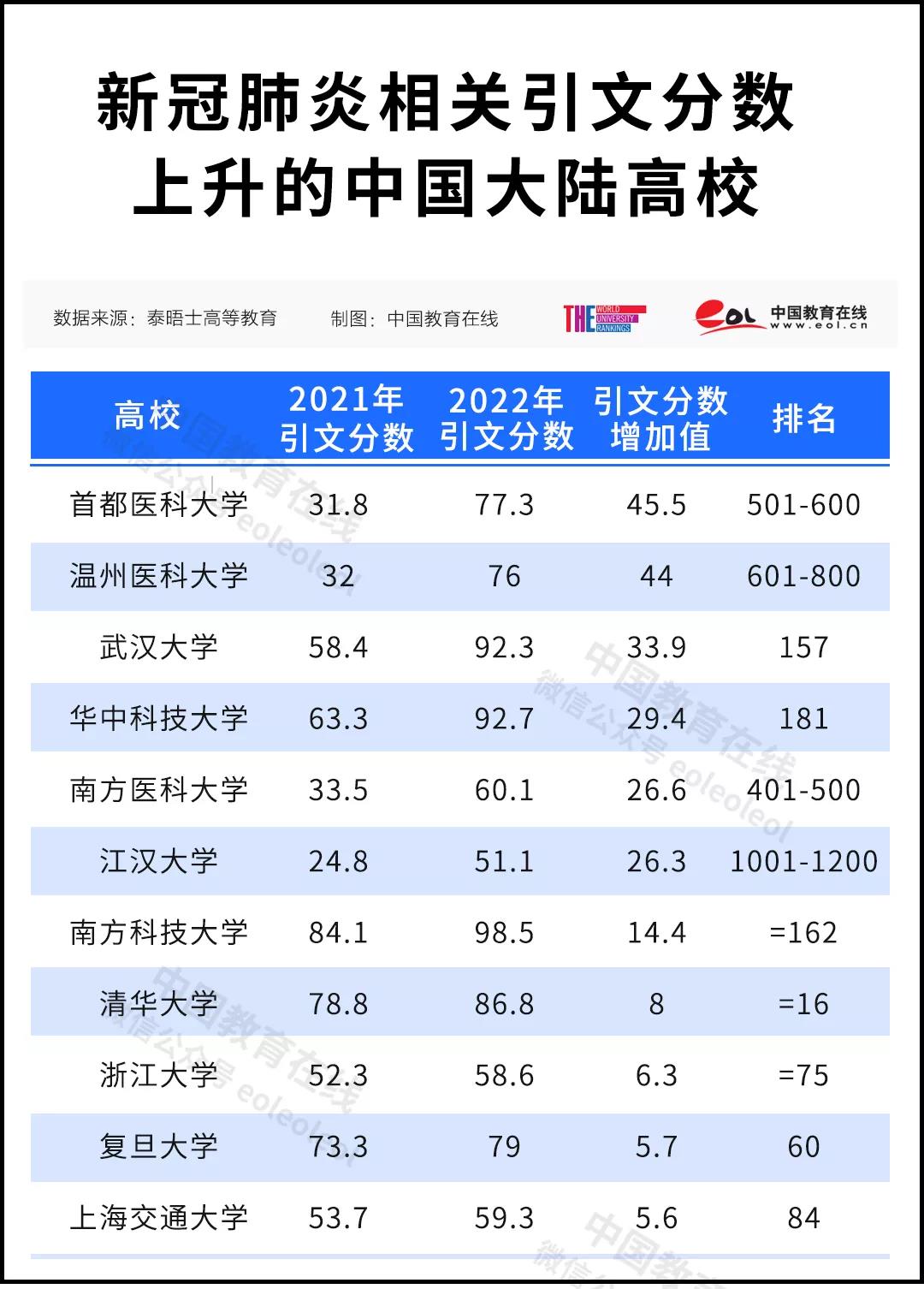 中國大陸 11 所高校的引文分數出現了提升,華中科技大學(第 181 名)、南方醫科大學(第 401-500 名)、首都醫科大學(第 501-600 名)和溫州醫科大學(第 601-800 名)的排名均至少上升了兩個區間。