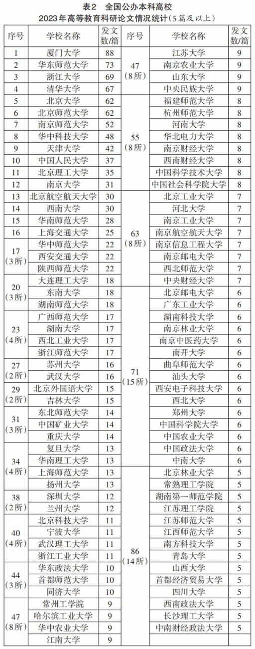 為更好地跟蹤、掌握我國高等教育科學研究的現狀與特征,服務于中國教育學自主知識體系建構,《中國高教研究》編輯部近期完成了2023年全國高校高等教育科研論文的統計分析工作。本次統計論文收錄期刊的范圍為中文社會科學引文索引(CSSCI)(2023—2024年)與《中文核心期刊要目總覽》(2023年版)中高等教育類“雙核”期刊,以及復合影響因子2.9以上、綜合影響因子2.1以上的教育綜合類“雙核”期刊,且均為“2022年度中國人文社會科學期刊AMI綜合評價”收錄期刊,共計23家。