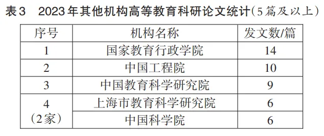 2023年,共有89家其他類機構在23家期刊發表論文152篇,機構平均發文1.71篇。共有5家機構發文在5篇及以上,合計發文45篇,占其他機構發文總量的29.61%,(見表3)共有10家機構發文3篇及以上,合計發文63篇,占比41.45%。