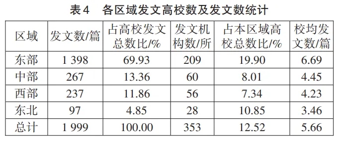 2023年東部地區高等教育科研發文高校占本區域高校總數的比例接近20%,相比之下其他3個區域的占比偏低;從區域高校發文數量與占高校發文總數的比例來看,東部地區也遙遙領先;從校均發文來看,東部地區校均發文6.69篇,遠高于中部地區的4.45篇,西部地區的4.23篇、東北地區的3.46篇。
