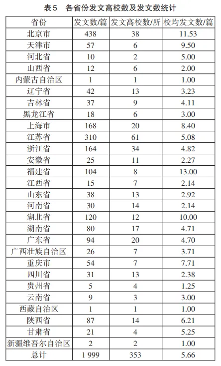 從省域分布來看,2023年度高等教育科研發文總量超過100篇的有6個省份,分別為北京、江蘇、上海、浙江、湖北、福建;從校均發文來看,福建、北京、湖北、天津、上海、重慶、陜西超過全國平均水平;海南、青海、寧夏3省區無高校發文。(見表5)數據顯示的高發文量和校均發文量一方面與高等教育資源優勢省份呈現一致性,如優質高等教育資源集聚的北京、天津、上海、江蘇、湖北、浙江等都是論文高產出省份;另一方面也與高等教育學科發展的優勢高校所在省份表現出高度的一致性,如作為高等教育學科優勢高校的廈門大學一校的發文量占到全省發文量的84.62%,天津大學、華東師范大學、浙江大學、華中科技大學分別占到其所在省份發文量的73.68%、43.45%、42.07%、40.00%,成為省域發文的產出大戶。