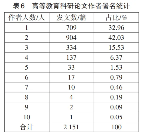 在統計作者署名情況的2151篇論文中,兩人聯合署名是占比最高的署名形式,其次為單獨署名。統計發現,聯合署名的總占比達67.04%,這顯示出高等教育科研活動中合作研究已經成為主流方式,呈現出有組織科研的雛形。高等教育學科發展進入成熟化階段,跨學科、跨主體的研究越來越深入,采用多樣化的研究方法、多學科的研究視角、多主體的信息采集方式使得不同背景的研究者組建起復合型研究團隊開展更深入、更廣闊的有組織研究。(見表6)以團隊形態開展的高等教育研究主題值得進一步分析挖掘,以反映高等教育科研的深層次結構。