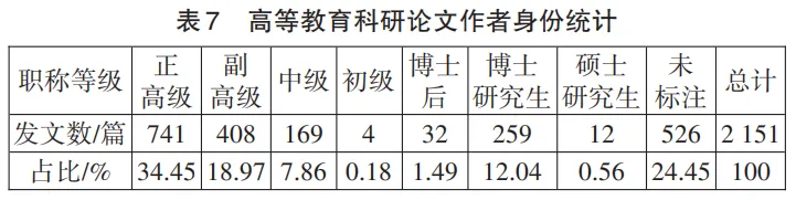 在職稱方面,論文統計顯示作者隊伍中具有副高級及以上職稱的人員比例較高,合計占比達到53.42%。在被統計的2151篇論文中,有1625篇論文的作者有職稱說明。如按照有標注職稱說明的論文作為基數計算,擁有高級職稱的占比為70.71%。除此之外,博士研究生的占比也較高。(見表7)由此反映出高影響力學術期刊凝聚著一批以資深專家學者為主要研究力量和以博士研究生群體為新生代力量的研究隊伍。