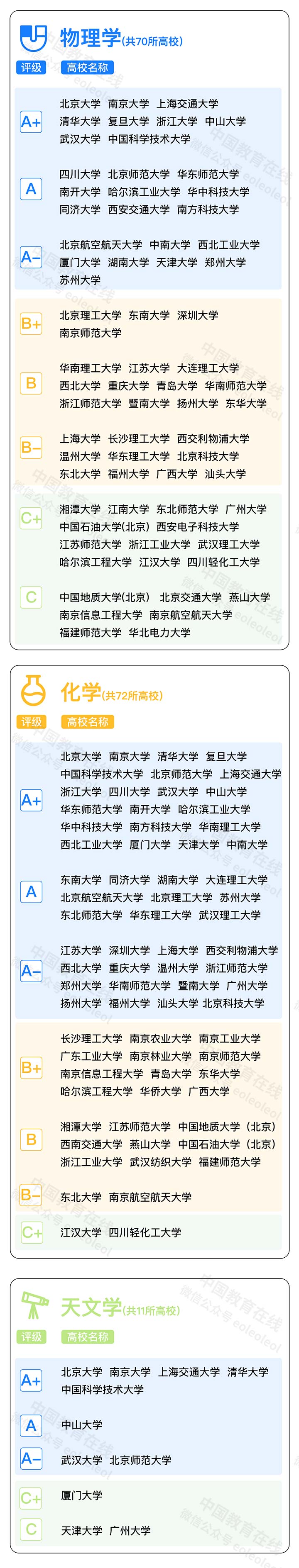 中國大陸有5所高校的天文學評級達到A+,分別為北京大學、南京大學、上海交通大學、清華大學和中國科學技術大學。總體而言,有21所中國大陸高校在至少一門理學學科中獲得A+評級。