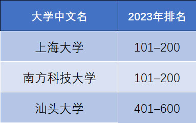 中國大陸總排名最高的高校是上海大學,位居總排名世界第97位。南方科技大學、汕頭大學和蘇州大學都位列世界前600名。