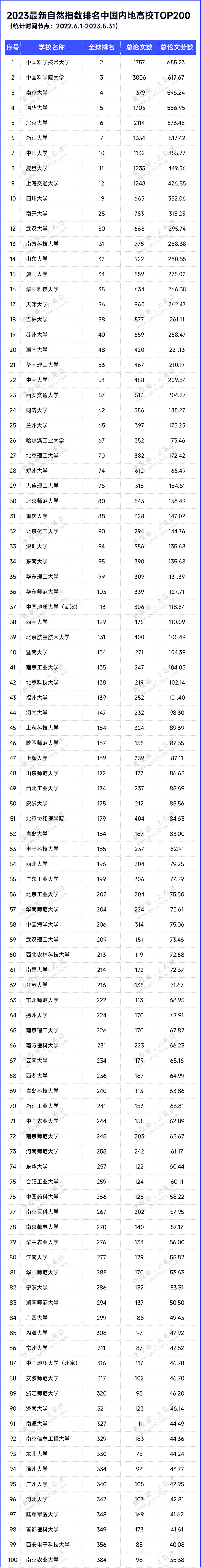 2023最新自然指數排名中國內地高校TOP200名單(2022.6.1-2023.5.31)如下: