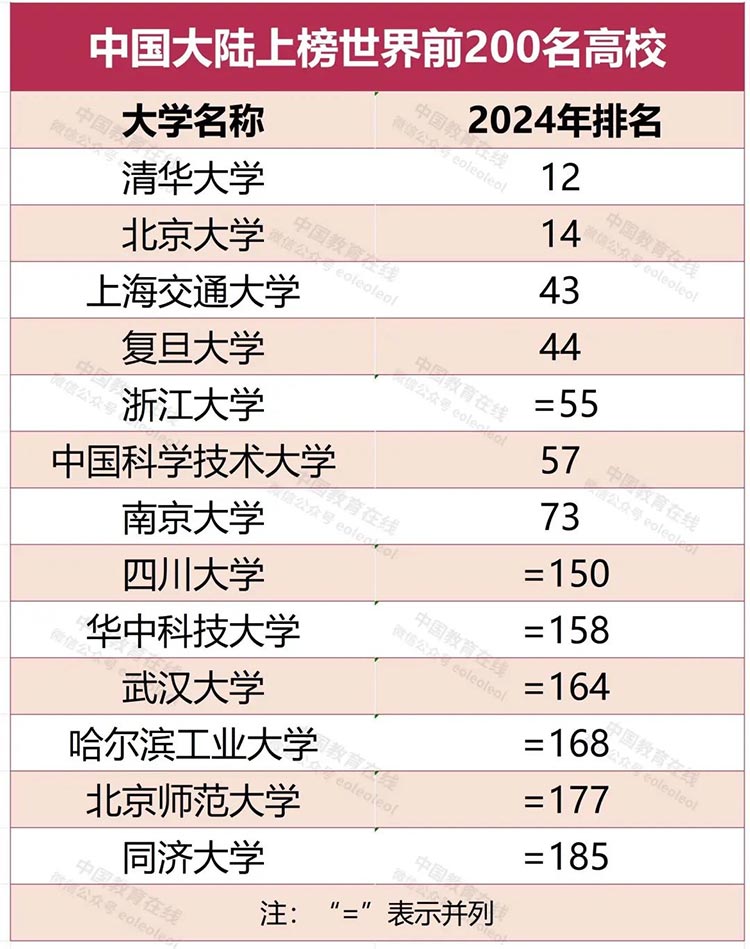 本屆排名,中國大陸有兩所大學進入前20名,7所大學進入前100名,13所大學進入前200名。在六年前發布的2018年世界大學排名中,中國大陸僅有兩所大學進入前100名。在過去的五年中,中國大陸高校在世界范圍內進步最大,總平均分從2020年的35.5分上升到2024年的48.9分。