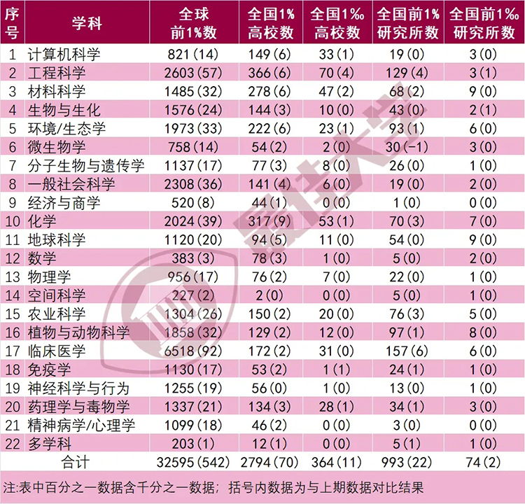 全球進入前百分之一的學科32595個,比上期增加542個,中國大陸高校進入前百分之一的學科2794個(新增70個),其中千分之一的學科364個(新增11個),表現強勁。機構進入前百分之一的學科993個(新增22個),千分之一的學科74個(新增2個)。具體情況如下表所示: