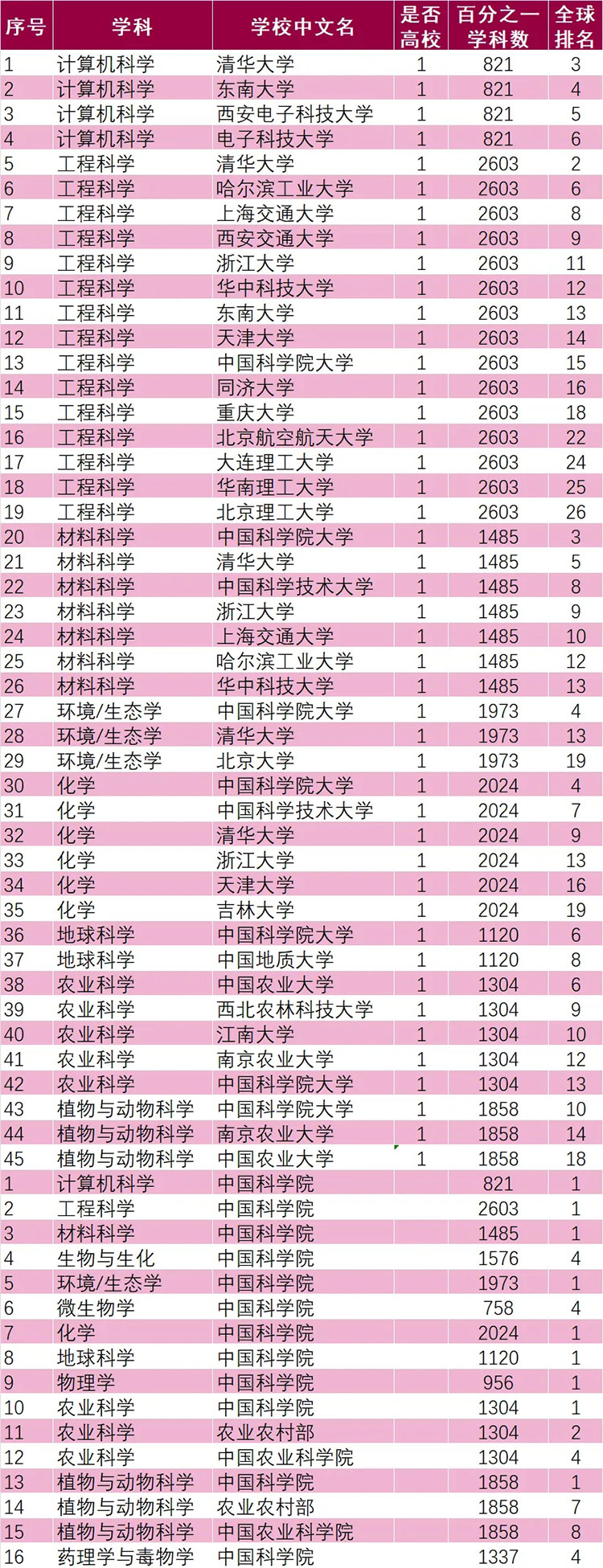 ESI萬分之一學科為全球頂尖水平行列學科的標志,目前我國大陸高校萬分之學科一共45個,其中中國科學院大學7個,清華大學5個,浙江大學3個,東南大學、哈爾濱工業大學、華中科技大學、南京農業大學、上海交通大學、天津大學、中國科學技術大學、中國農業大學各2個,北京大學、北京航空航天大學、北京理工大學、大連理工大學、電子科技大學、華南理工大學、吉林大學、江南大學、同濟大學、西安電子科技大學、西安交通大學、西北農林科技大學、中國地質大學、重慶大學各1個。