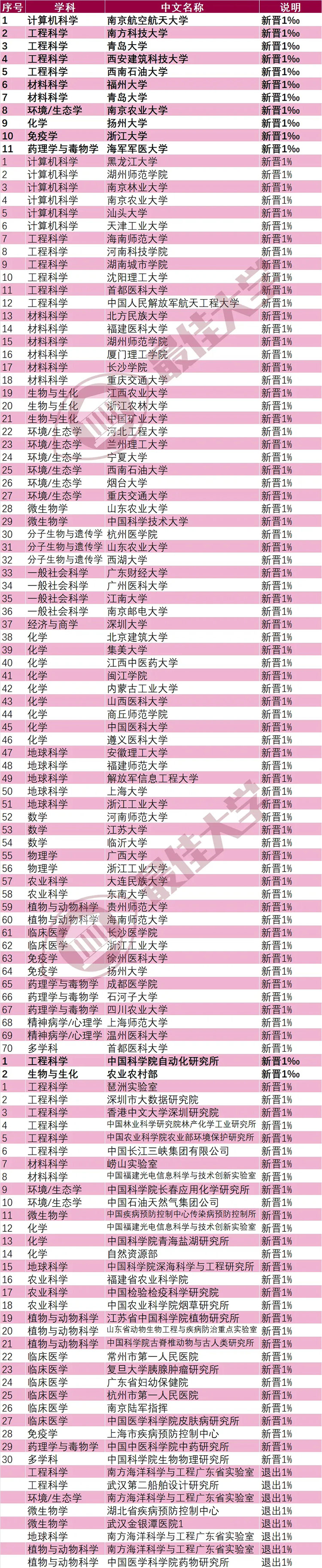新晉千分之一的11個學科,包括南京航空航天大學的計算機科學,南方科技大學、青島大學、西安建筑科技大學、西南石油大學的工程科學,福州大學、青島大學的材料科學,南京農業大學的環境/生態學,揚州大學的化學,浙江大學的免疫學,海軍軍醫大學的藥理學與毒物學等。