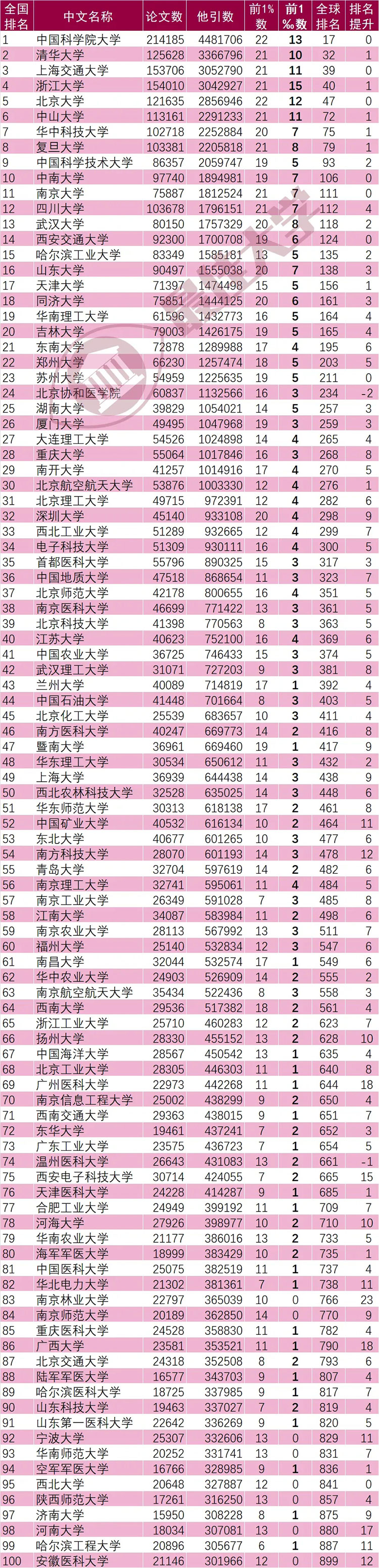 全國有學科進入全球前1%的所高校中(北京協和醫學院計入高校,北京協和醫院計入機構,分開計算),中國科學院大學全球排名17名居全國第一,清華大學(1)(括號內數字表示全球范圍內提升名次,下同)全球排名32名居全國第二,上海交通大學全球排名39名居全國第三,浙江大學(1)全球排名40名居全國第四、北京大學全球排名47名居全國第五、中山大學(1)全球排名72名居全國第六、華中科技大學(1)全球排名75名居全國第七、復旦大學(1)全球排名79名居全國第八、中國科學技術大學(2)全球排名93名居全國第九、中南大學全球排名106名居全國第十。