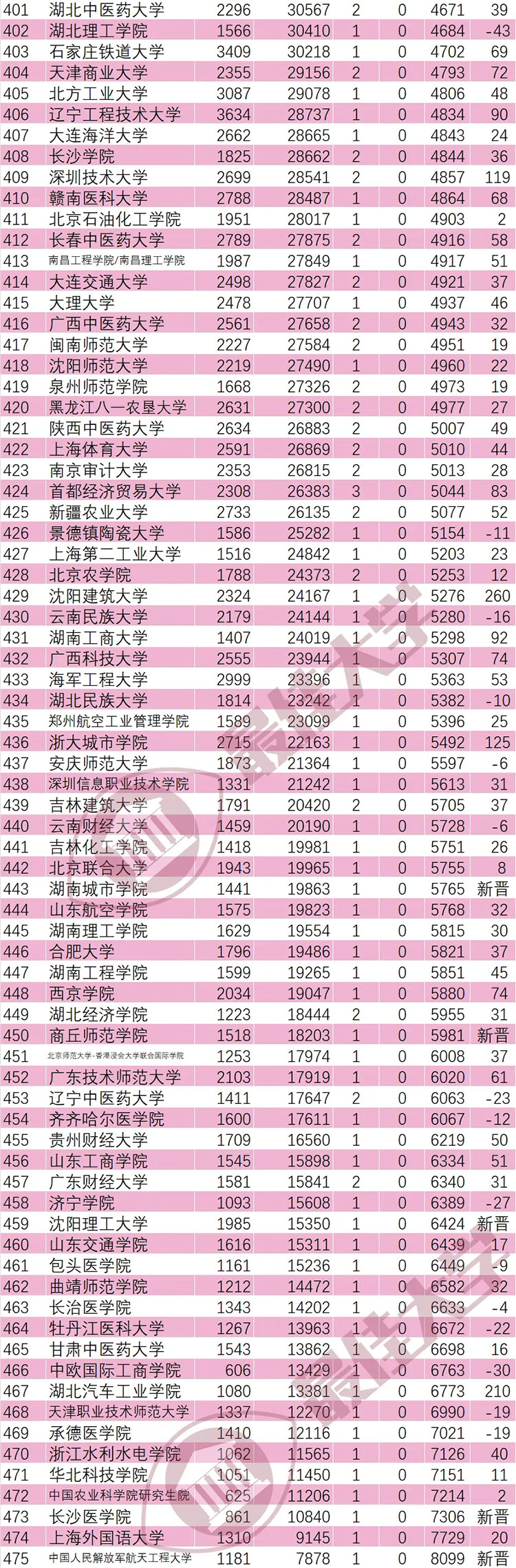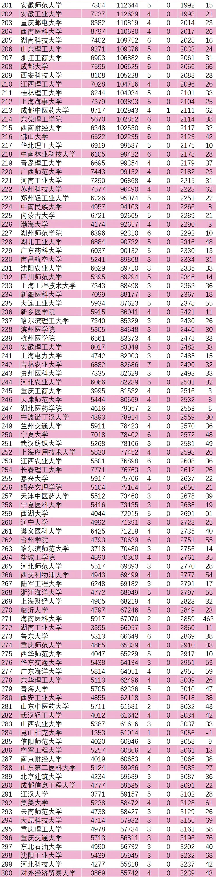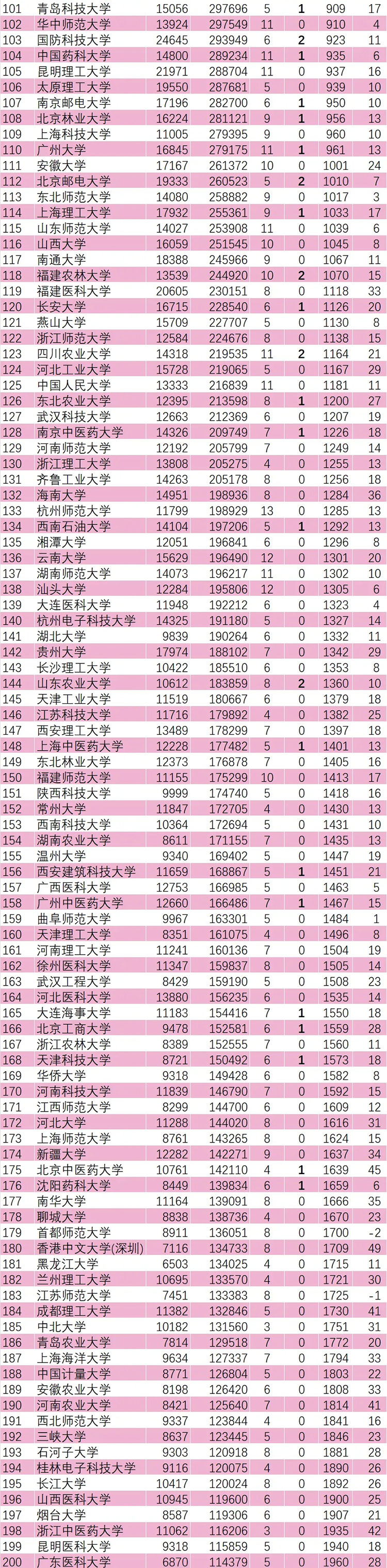 另外,海南醫科大學(463)、沈陽建筑大學(260)、湖北汽車工業學院(210)、浙大城市學院(125)、深圳技術大學(119)、天津大學-新加坡國立大學福州聯合學院(94)、湖南工商大學(92)、西湖大學(91)、遼寧工程技術大學(90)、重慶科技大學(85)、首都經濟貿易大學(83)、東北電力大學(79)、西華大學(78)、重慶交通大學(76)、華北水利水電大學(76)、安徽工程大學(75)、西安工程大學(75)、廣西科技大學(74)、西京學院(74)、山東建筑大學(72)、仲愷農業工程學院(72)、天津商業大學(72)進步均超過70名,表現強勁。