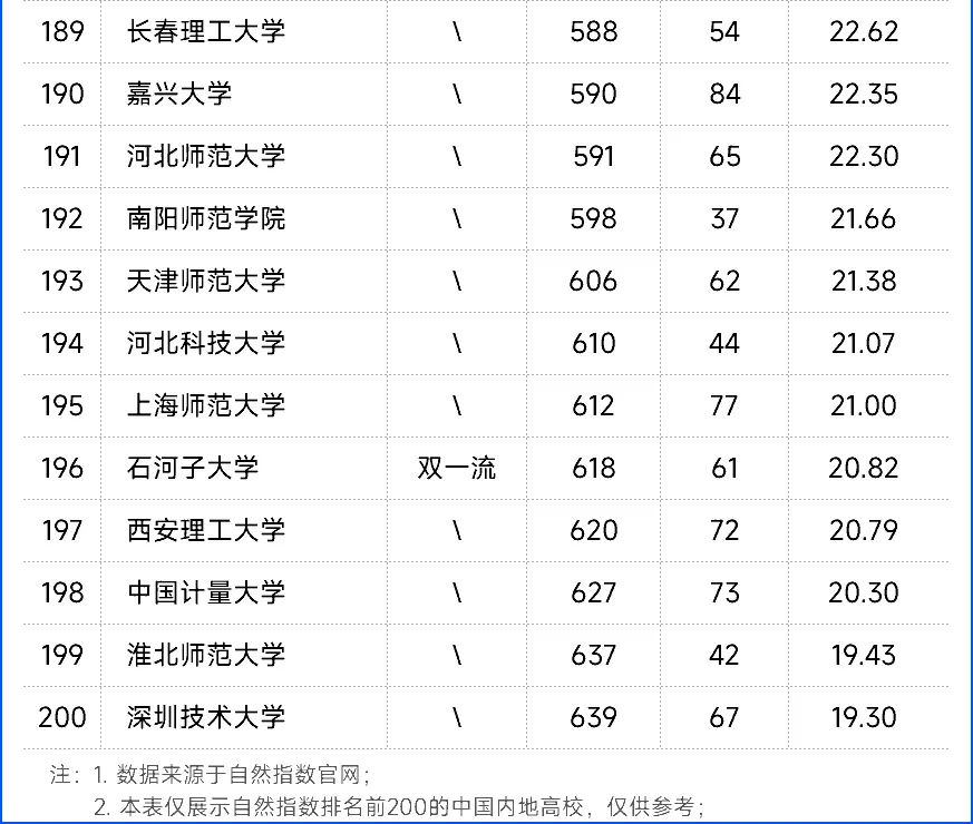 最新自然指數排名中國內地高校Top200名單(統計時間節點為2024.8.1-2025.7.31)
