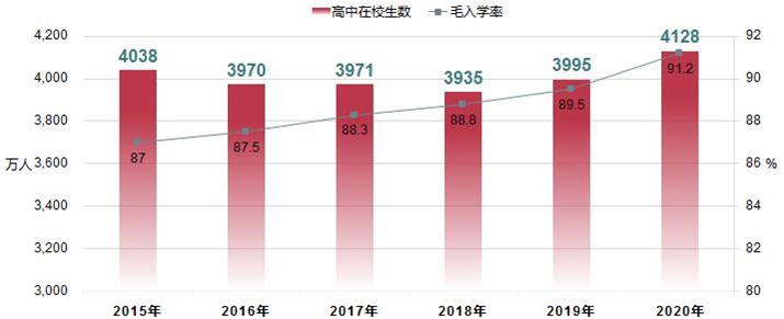 2020年,全國高中階段共有學校2.44萬所。招生1504.00萬人,在校生4127.80萬人。高中階段毛入學率91.2%。