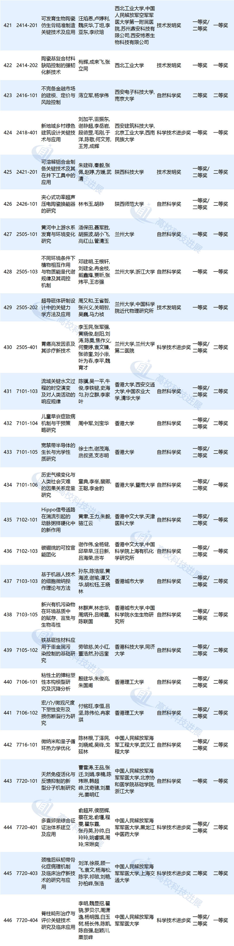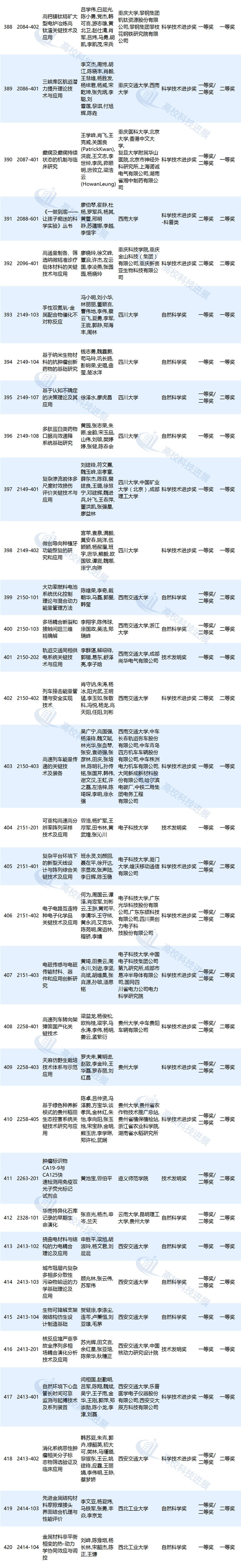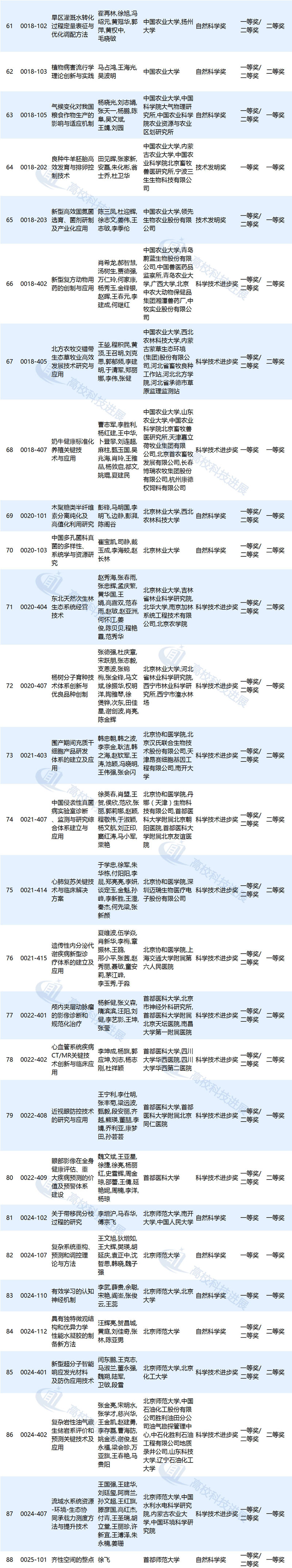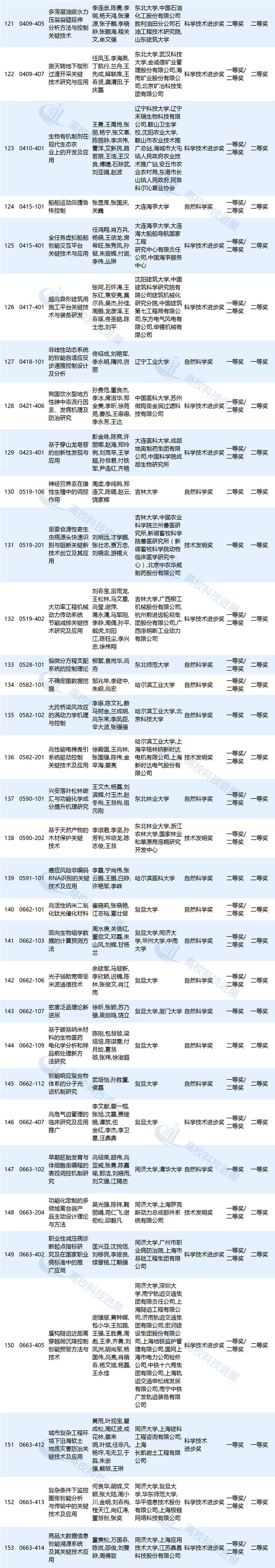 作為第一完成單位,上海交通大學獲獎項目為25項,清華大學獲獎項目為20項,北京大學、浙江大學獲獎項目分別為17項,東南大學獲獎項目為11項,東北大學獲獎項目為9項,中國農業大學、同濟大學、江南大學、中國石油大學(華東)等高校獲獎項目分別為8項,大連理工大學、復旦大學、南京大學等高校獲獎項目分別為7項,武漢大學、華南理工大學、四川大學等高校獲獎項目分別為6項,北京航空航天大學、華東理工大學、山東大學等高校獲獎項目分別為5項,北京科技大學、北京林業大學、北京協和醫學院等高校獲獎項目分別為4項(高校獲獎情況詳見文末附表)。