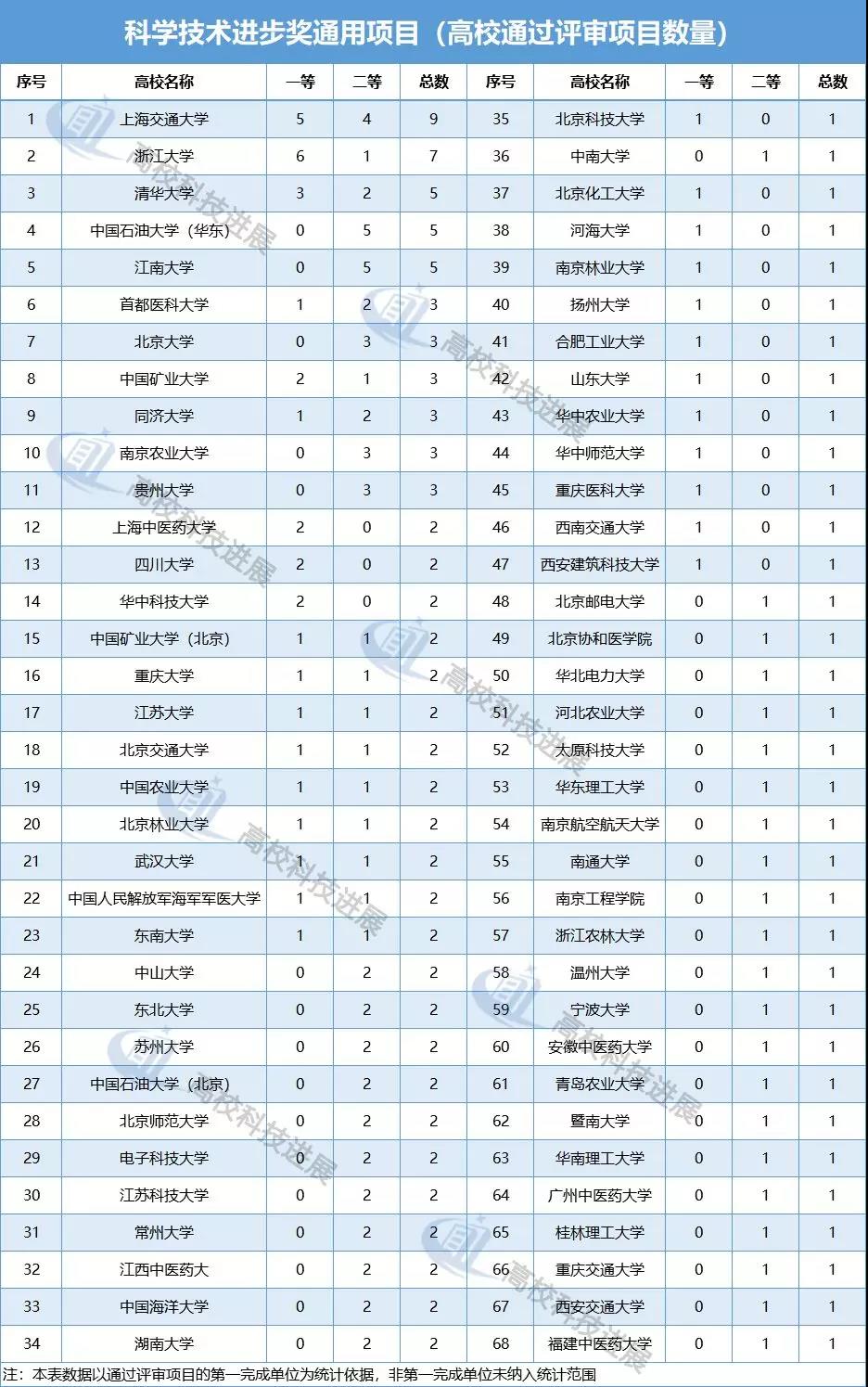 從科學技術進步獎通用項目的會議評審結果來看,共有68所高校推薦項目通過評審,獲通過項目的高校數量與自然科學獎相差無幾。