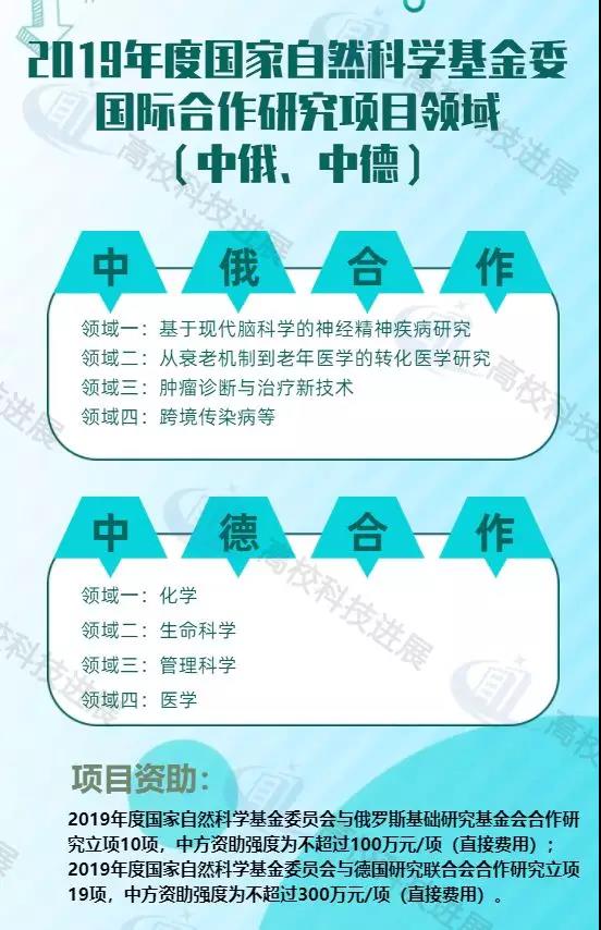 另據高校科技進展(公眾號:gxkjjz)觀察,2020年度國家自然科學基金委與德國研究聯合會合作研究項目申報已開始,資助領域為數理科學、地球科學、工程與材料科學、信息科學,中方資助強度為不超過300萬元/項。截至目前,2020年度國家自然科學基金委與俄羅斯有關方面合作研究項目的相關申報文件,暫未見發布。
