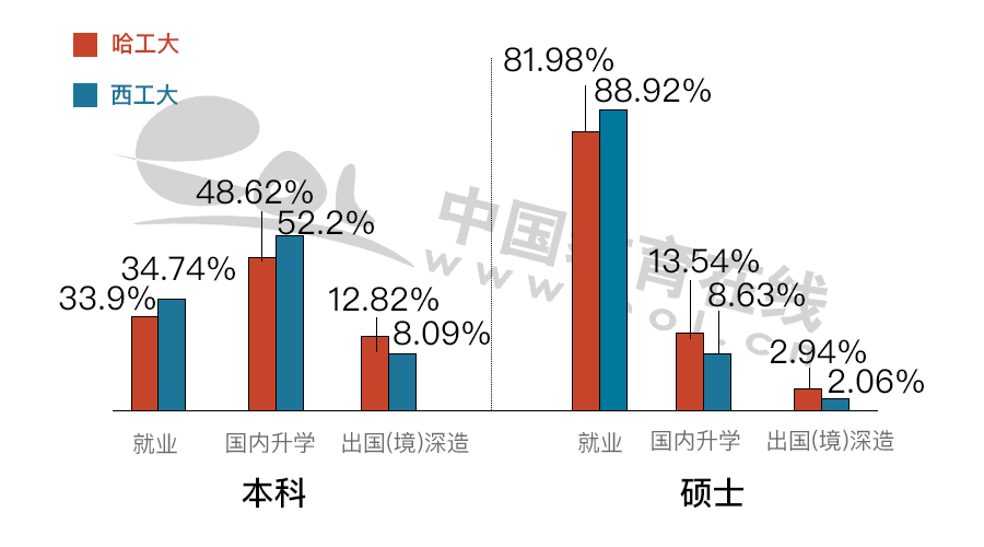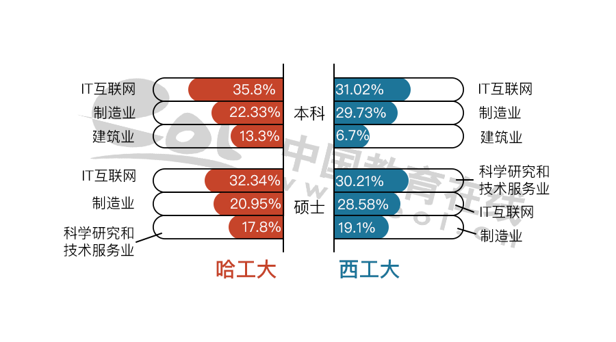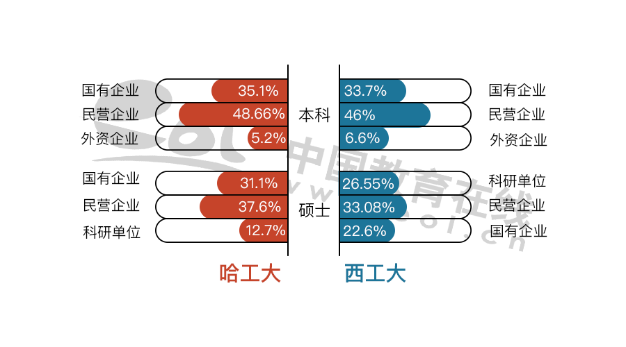 哈工大碩士畢業生在國有企業的比例比西工大高。