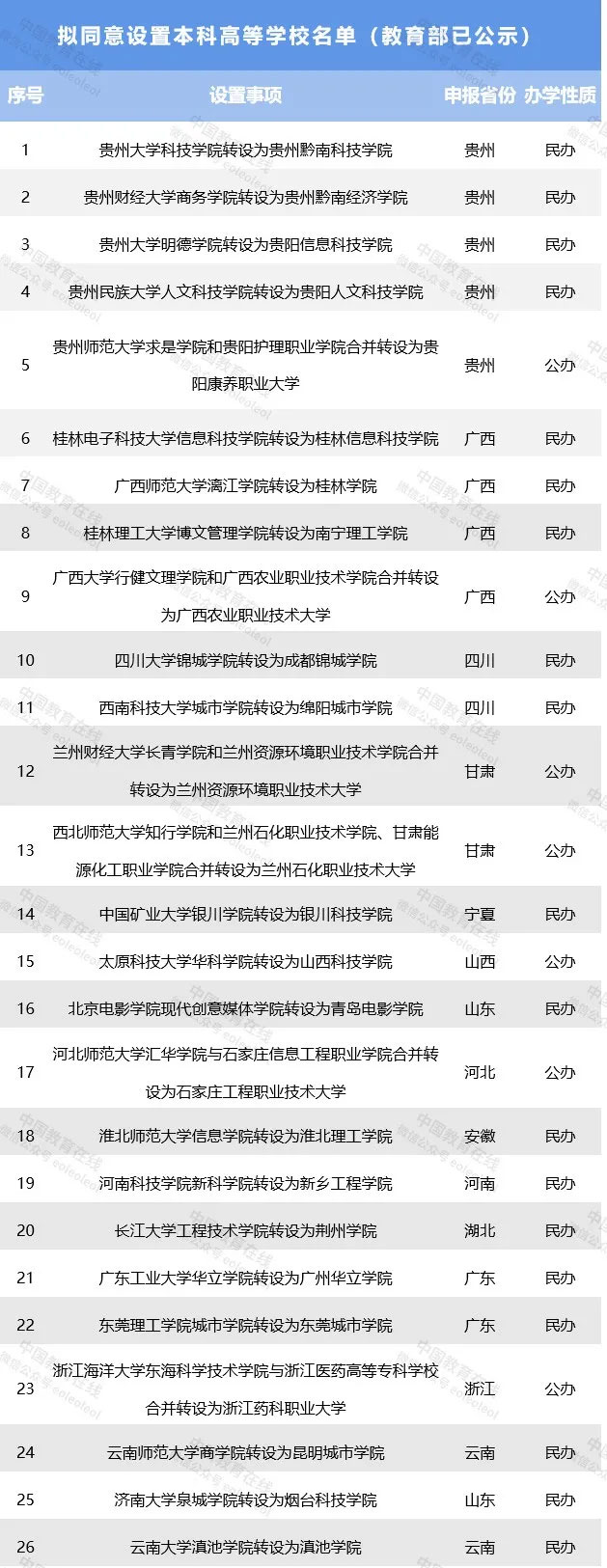 5月25日,湖南教育廳公示設立3所公辦職業本科大學,都是由獨立學院和公辦職業技術學院合并轉設而來。