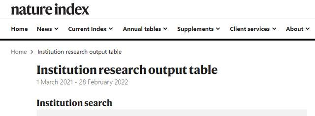 自然指數(Nature Index)于2014年11月首次發布,是依托于全球頂級期刊(《自然》系列、《科學》《細胞》等82種自然科學類期刊),統計各高校、科研院所(國家)在國際上最具影響力的研究型學術期刊上發表論文數量的數據庫。運用這個數據庫,可以根據各機構的論文發表數量及類別來進行排名和期刊索引。目前,自然指數已發展成為國際公認的能夠衡量機構、國家和地區在自然科學領域的高質量研究產出與合作情況的重要指標,在全球范圍內有較大影響力。