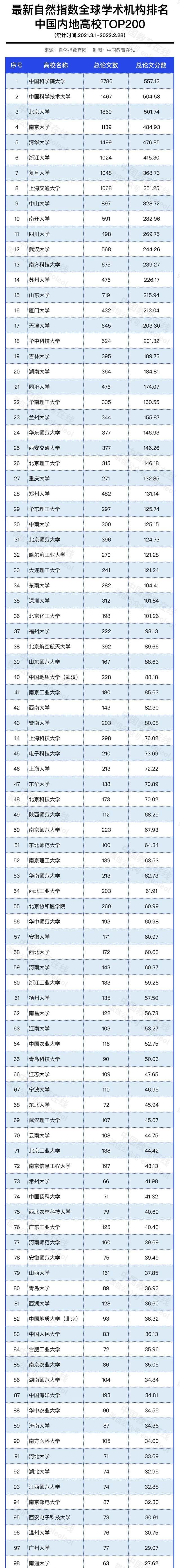 近日,自然指數官網更新了最新的自然指數排名(統計時間節點為2021.3.1-2022.2.28)。最新自然指數排名中,中國科學院依然盤踞全球各高校、科研院所的榜首位置。中國內地大學中,中國科學院大學位居內地高校第一。