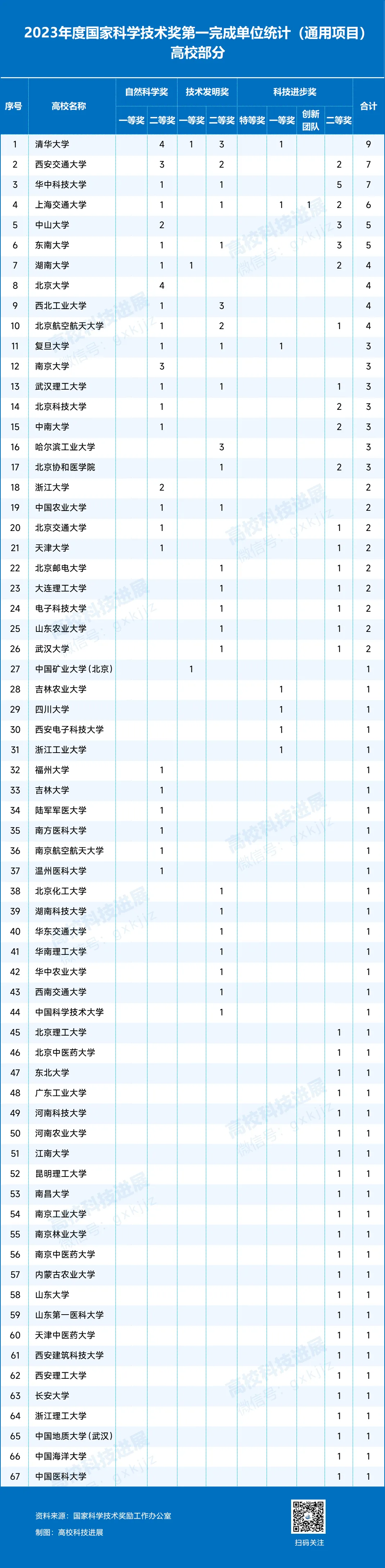 總體來看,清華大學總獲評9項,西安交通大學和華中科技大學獲評7項,上海交通大學獲評6項,中山大學和東南大學各獲評5項,北京大學、湖南大學、西北工業大學、北京航空航天大學均獲評4項。復旦大學、南京大學、武漢理工大學、北京科技大學、中南大學、哈爾濱工業大學、北京協和醫學院等7所高校各獲評3項。