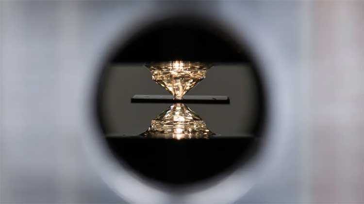 一種氫、硫和碳的化合物被壓在兩顆鉆石之間,在室溫下實現超導。圖源/ADAM FENSTER
