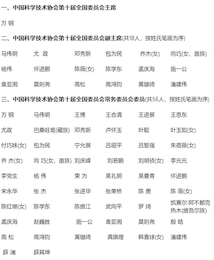 中國科學技術協會第十屆全國委員會主席、副主席、常務委員名單