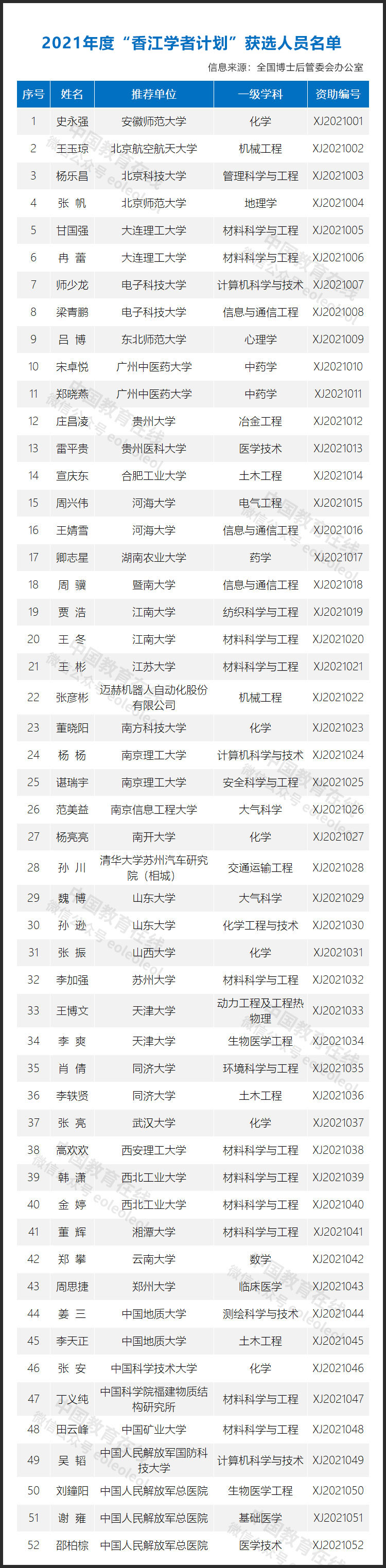 根據《全國博士后管委會辦公室與香港學者協會聯合培養博士后研究人員計劃協議書》的規定,全國博士后管委會辦公室和香港學者協會分別于今年5月和7月在北京和香港組織專家對2021年度“香江學者計劃”申請者進行評審,最終確定52名獲選人員(名單見附件)。