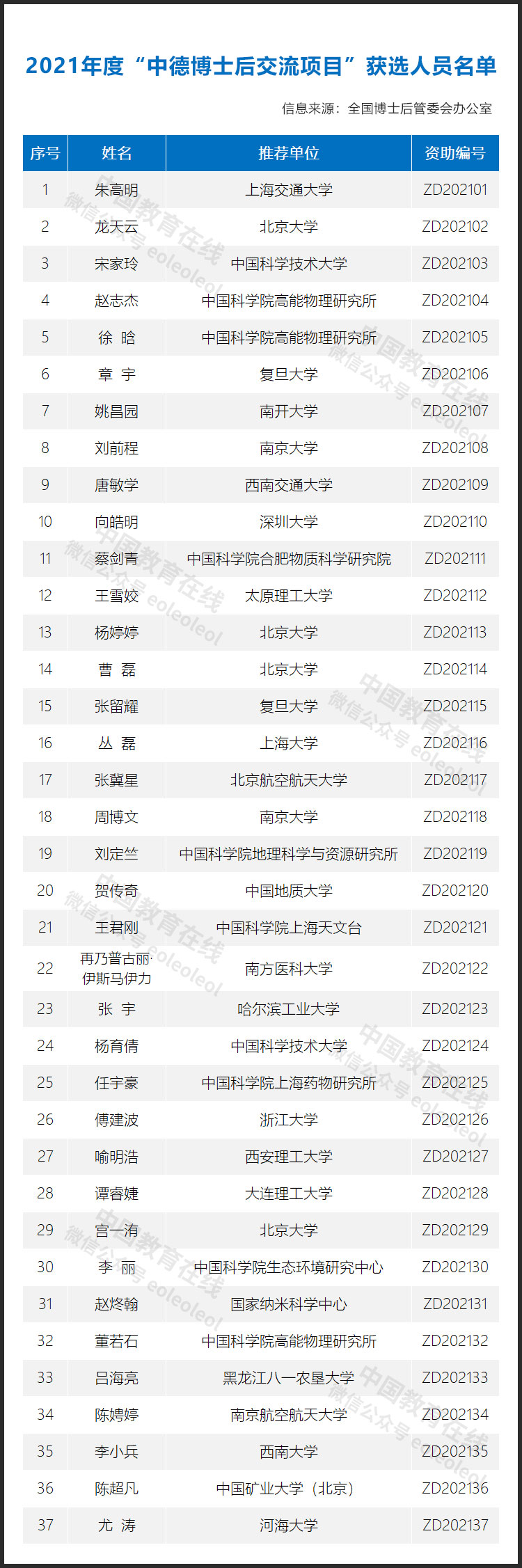 8月9日,全國博士后管委會辦公室公布了四個項目的資助結果,包括2021年度 “香江學者計劃”、2021年度“澳門青年學者計劃”、2021年度“中德博士后交流項目”、2021年度“國際交流計劃學術交流項目”獲選人員名單,共152人入選資助名單。