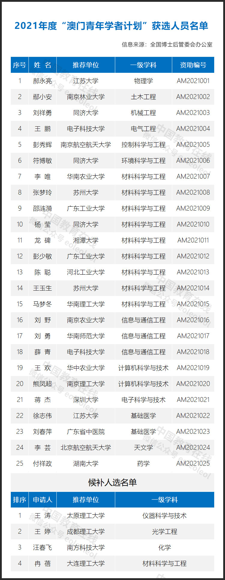 根據《全國博士后管委會辦公室與澳門科學技術協進會聯合培養博士后研究人員計劃(簡稱“澳門青年學者計劃”)協議書》的規定,全國博士后管委會辦公室和澳門科學技術協進會分別于今年5月和7月在北京和澳門組織專家對2021年度“澳門青年學者計劃”申請者的材料進行評審,最終確定25名資助人員和4名候補人選。
