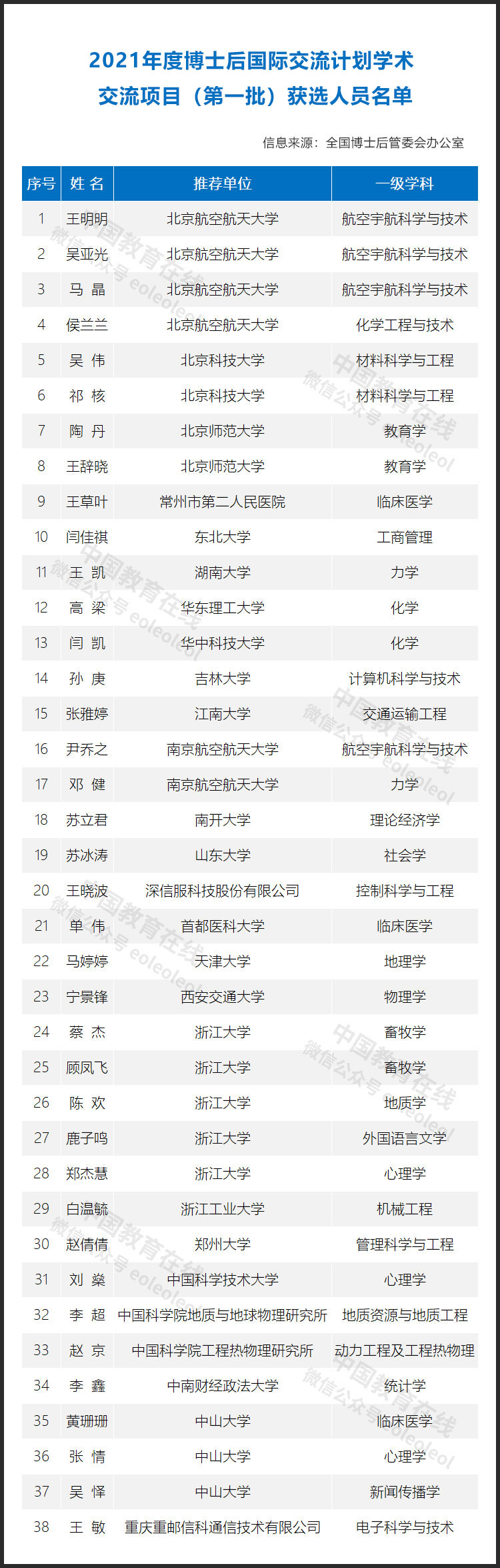 為進一步加強博士后國際交流,提升博士后培養質量,按照《全國博士后管委會辦公室2021年博士后國(境)外交流項目申報工作的通知》(博管辦〔2021〕6號)的要求,組織開展了2021年度博士后國際交流計劃學術交流項目申報工作,經過全國博士后管委會辦公室遴選,最終確定了2021年度博士后國際交流計劃學術交流項目(第一批)的獲選名單(詳見附件)。