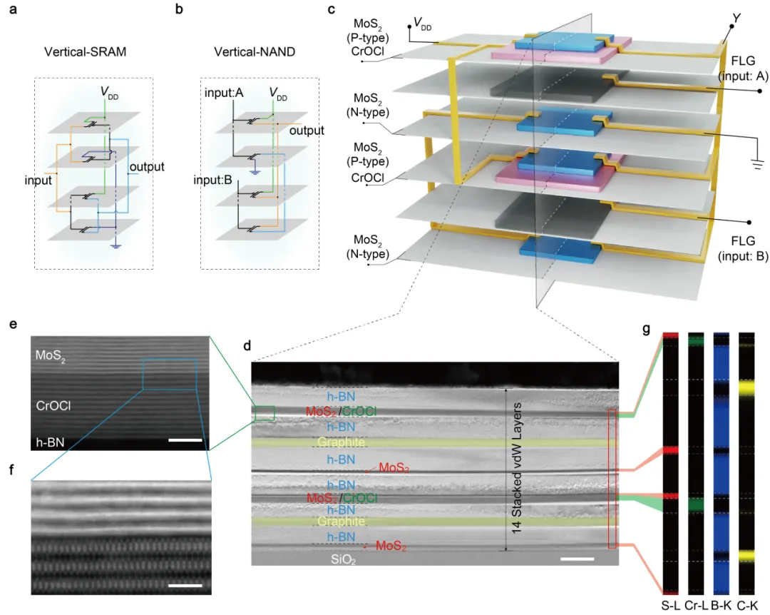 在此基礎上,該研究團隊利用垂直堆疊的方式制備了由14層范德華材料組成、包含4個晶體管的互補型邏輯門NAND以及SRAM等器件(如圖1所示)。