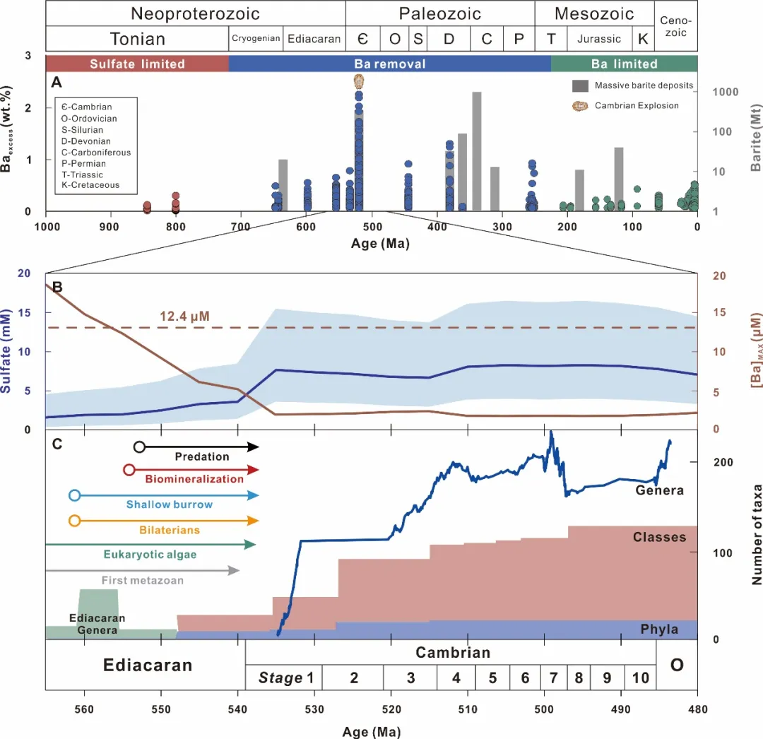 近期,衛煒等人通過揚子板塊下寒武統富金屬頁巖的鋇同位素數據發現,埃迪卡拉紀-寒武紀過渡時期海洋的逐漸氧化提升了硫酸根濃度,導致此前累積的溶解鋇離子以重晶石形式被大量移除。水體中高濃度的鋇會抑制水生動物的存活率,因此,對動物有毒害作用的硫化物和鋇離子的移除,改善了海洋的宜居性,促使了寒武紀生命大爆發。