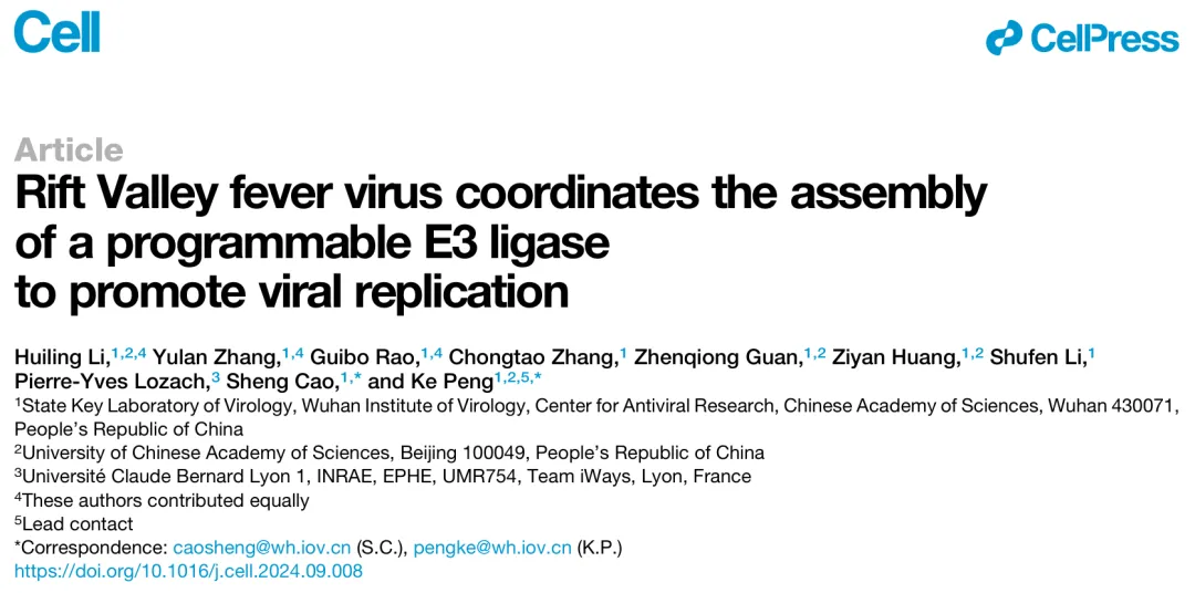 近日,中國科學院大學(以下簡稱“國科大”)博士生導師、中國科學院武漢病毒研究所(以下簡稱“武漢病毒所”)研究員彭珂、曹晟團隊在Cell上發表了題為“Rift Valley fever virus coordinates the assembly of a programmable E3-ligase to promote viral replication”的研究論文。該研究揭示了裂谷熱病毒非結構蛋白NSs重塑宿主E3泛素連接酶系統性抑制宿主抗病毒免疫的致病新機制。國科大2021級生物化學與分子生物學專業博士生李慧玲,武漢病毒所實驗師張玉蘭、饒桂波為共同第一作者。