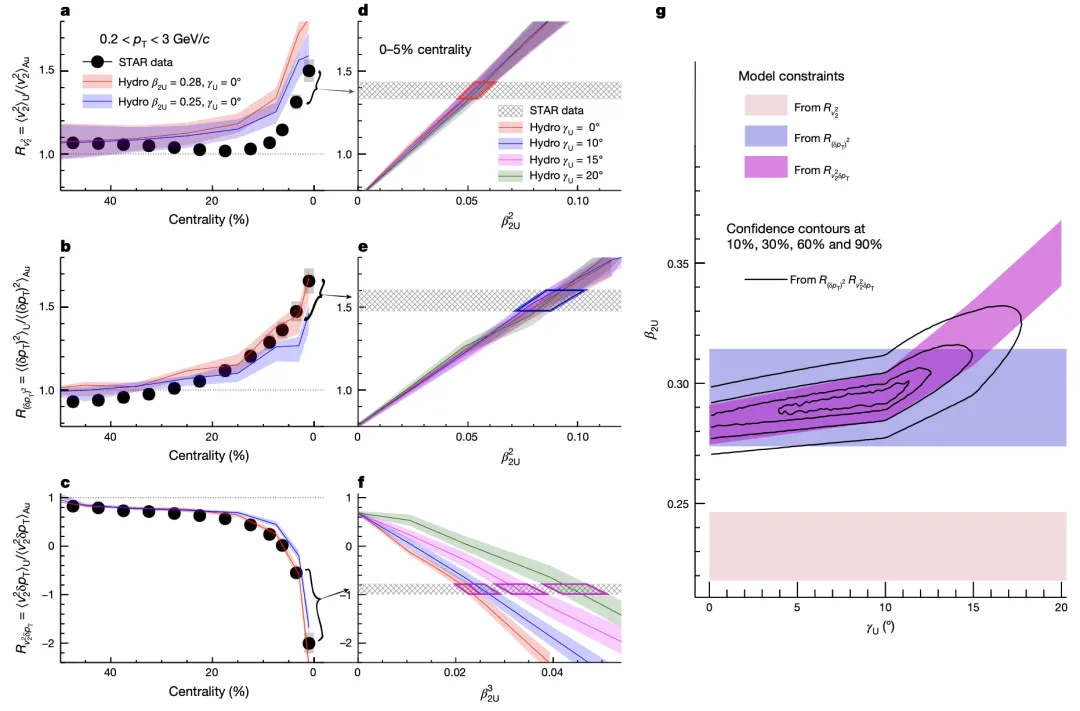 在《自然》論文中,馬余剛院士團隊與合作者在STAR實驗組以接近球形的金核-金核碰撞為基準,精準成像原子核結構特征,定量提取了鈾核-鈾核碰撞中鈾-238原子核的四極軸對稱形變(β2)和三軸形變(γ)結構信息。