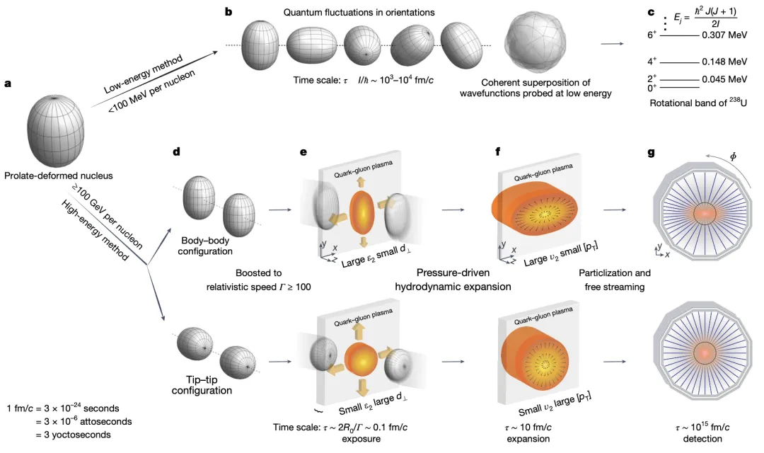 相比之下,相對論重離子碰撞在成像原子核結構研究方面具有獨特性。如圖2所示,相對論能量下,原子核會發生洛倫茲收縮,相互作用持續時間為幺秒尺度(約 10-24 秒),遠低于實驗室系下原子核量子漲落的時間尺度 (約 10-21 秒),甚至比2023年諾貝爾物理學獎研究物質電子動力學的阿秒激光脈沖小六個量級。具有奇特結構的原子核在極端中心對撞區間會呈現不同的碰撞構型,這將影響初態能量沉積以及能量密度分布在QGP幾何空間中的各向異性分布。